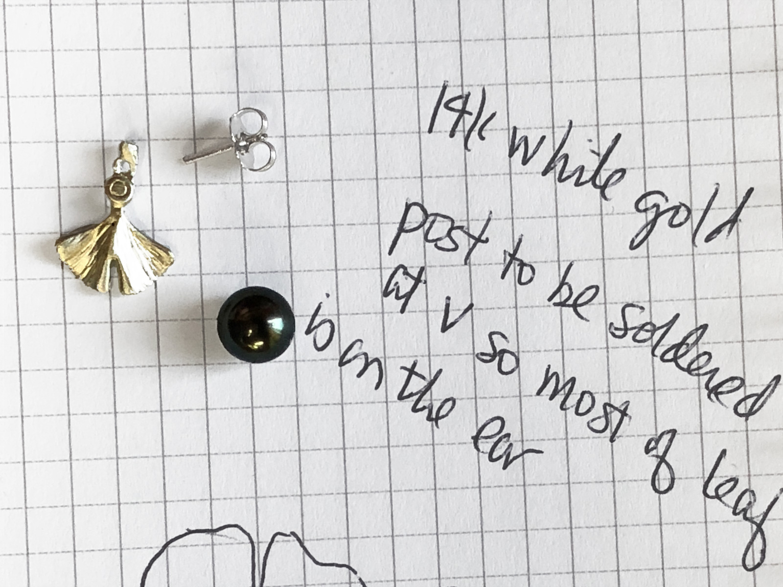 repeat customer but now she is his wife and as a merchant marine, travels the world. so while in the south seas, he purchased a beautiful pair of black Tahitian pearls. just look at that glow! she is tall and lithe in stature with small ear lobes, wanted something to wear with jeans and the little black dress, loves ginkgo leaves and wanted something that hangs from her ear.