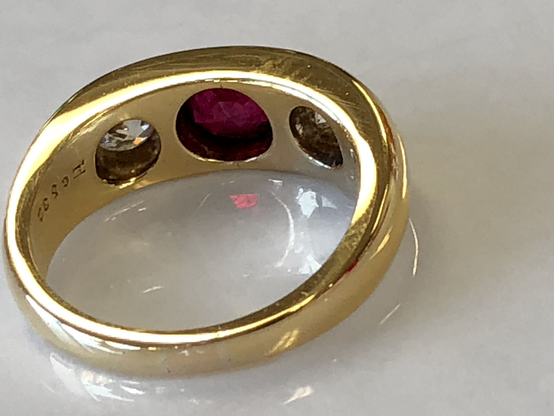 14k yellow gold ring with two European-cut diamonds and one European-cut ruby.
