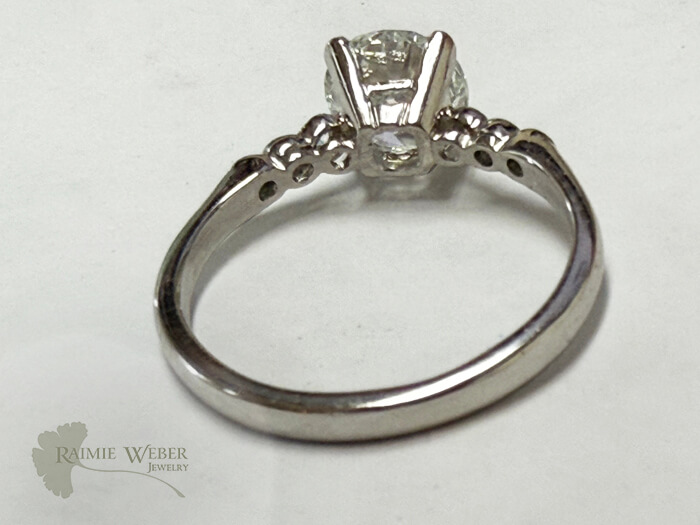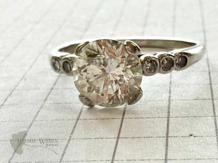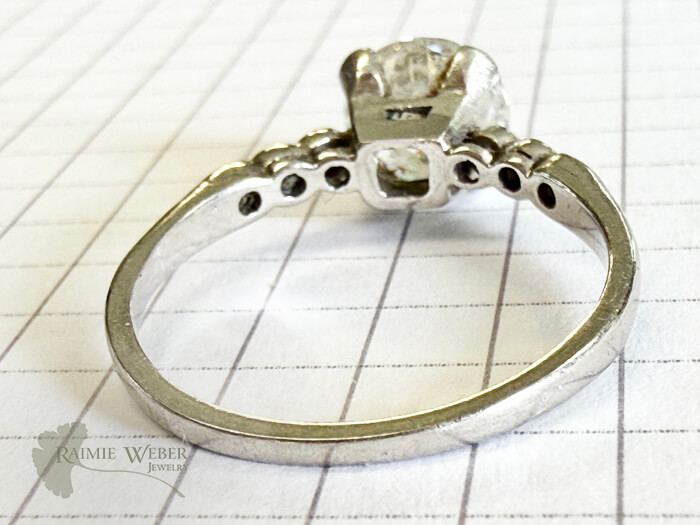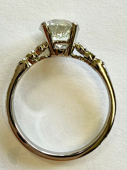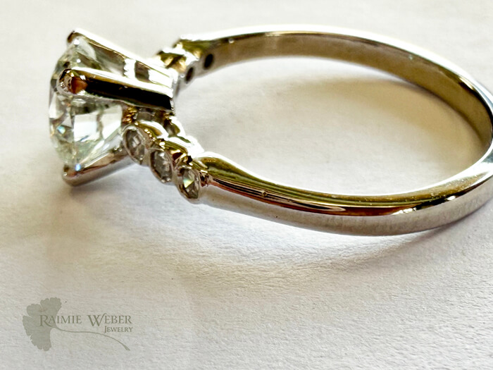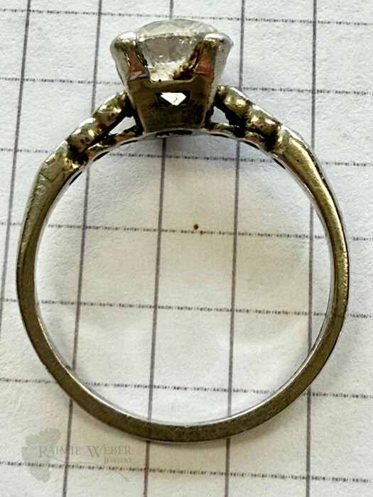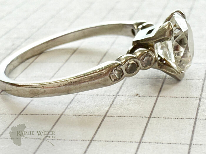 I’ve recently partnered with an incredibly talented platinum-smith who specializes in restoration. Pictured is an Art Deco mounting that has been well-loved and worn for many decades. The center crown had been undercut by wearing this against a wedding band, so much so that the prongs looked splayed from the side and there was not much to securely hold the diamond in place. The single cut diamonds, set in bezels on the cathedral shoulders, were also compromised. Most had a fair amount of damage. The shank was also heavily worn and in need of attention. As we began the restoration process, the first thing to do was to thoroughly clean the mounting. When working with platinum and diamonds there cannot be a speck of dirt on either the stones or the metal to prevent contamination and the risk of the stones burning due to debris. The next thing to do was to examine the ring to determine exactly what was needed as well as how the restoration was to proceed. The center crown needed to be built up. Both the prongs that sit on top of the diamond as well as the gallery wire were visible from the side of the ring. This setting is known as a box style, subtly square. The shoulders are a series of bezels. Most of these needed to be reinforced and the decision was made to replace the single cut diamonds, as most were damaged, and replace with diamonds with better color and clarity. The shank also needed to be replaced with a new one by measuring the original width as well as its thickness. All of this work was done with pure platinum wire and a laser. Traditionally, platinum work is done with a torch and a flame this so hot that one needs to wear cobalt blue glasses to protect the eyes. It takes a very steady hand and eye to do work with platinum, whether with a torch or laser. Once these modifications were complete, the ring was polished bright. And wow, was the finished ring spectacular. Polishing removes the patina of the ring acquired over time with wearing, but this will patina with time and wear as well. While some prefer this, as it gives more of an antique look, with regular polishing platinum can maintain its shine. It’s really just a matter of preference. If you have a platinum piece of jewelry that’s in need of some reworking, be sure to get in touch as I have the partners to make this happen ever so beautifully.