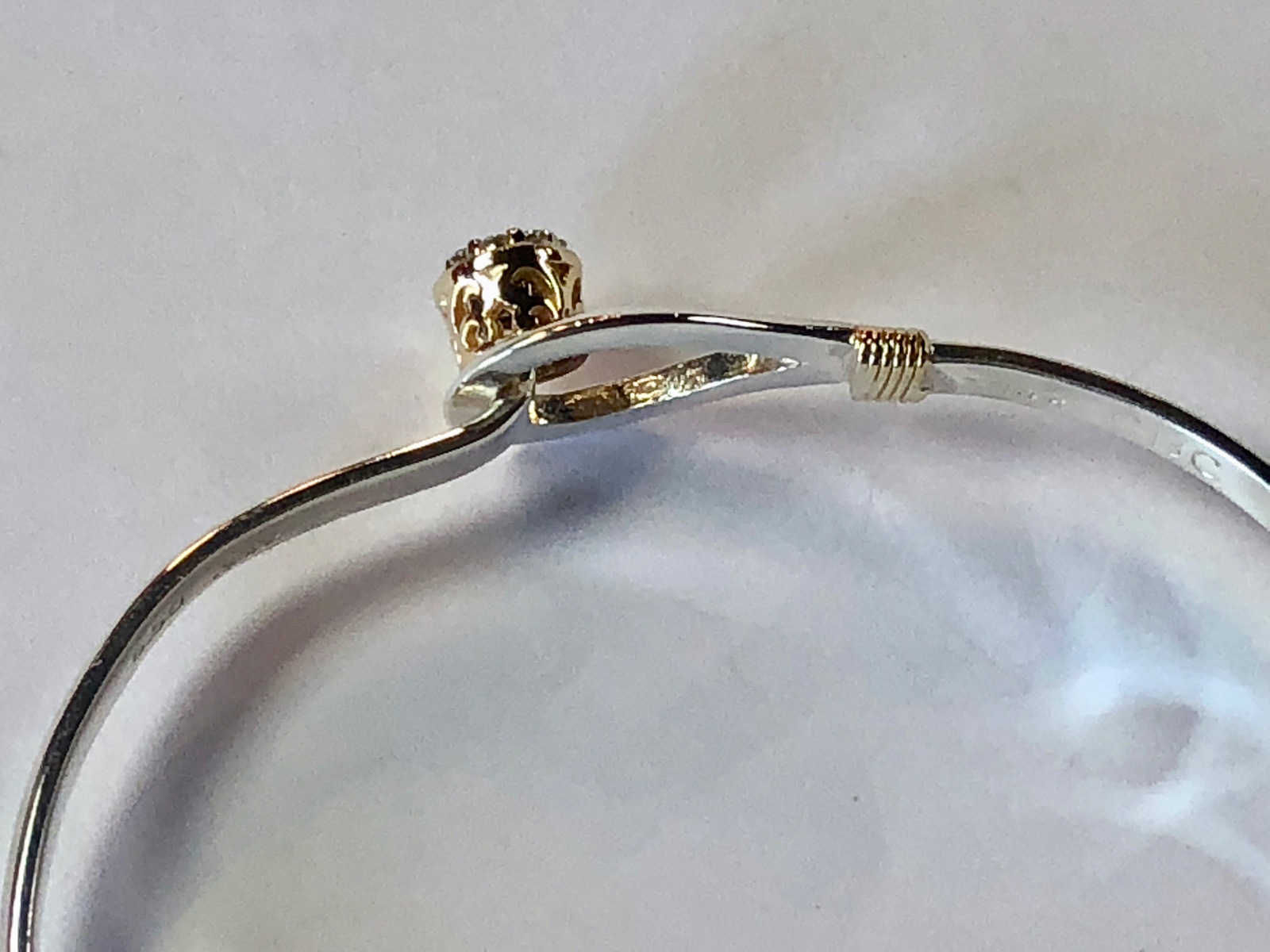 that diamond earring was gorgeous with a total of 8 diamonds and set to give the sparkly illusion of one larger stone. we treated the cluster as if it was a single stone; we set it into the decorative bezel so it can act as a lock for the loop or hook closure of the bracelet. i used a yellow gold bezel to compliment the yellow gold roped accent on the bangle that is made from solid half-round sterling silver wire.