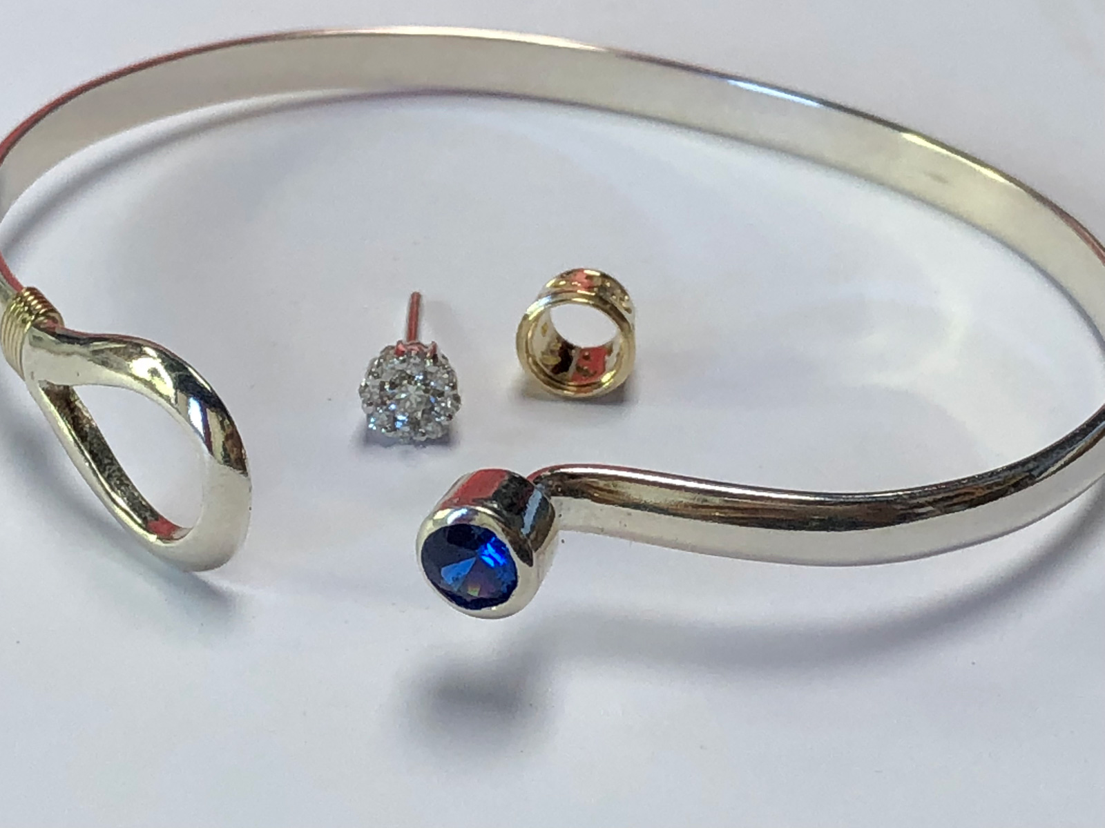 she was expecting a bonus and wanted to treat herself with something special. she was thinking of something to wear everyday, a little bit of bling and a marriage of metals. my thoughts turned to some bits and pieces of jewelry around the shop-a bangle bracelet with a synthetic sapphire and a half-pair of diamond earrings were available for custom fabrication.
