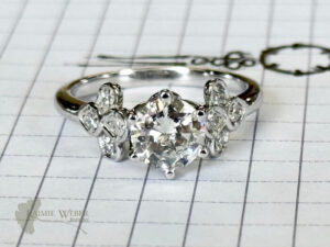 This is the second design I had the privilege to do for this client. She is a funny, vivacious person with a keen sense of humor. She moved out of the area but when visiting she made a special trip to see me. She had a general idea that she wanted something to memorialize her marriage with some of the remaining stones that were left from the redesign of her wedding set. As we were chatting and catching up on life I asked her how they first met. She had quite the funny story to share. At the end of their first time meeting, sparks were flying and he asked for her phone number. She did not have a piece of paper (as this was before cell phones existed). He pulled a $5 bill out of his pocket and they giggled as she jotted down her number on there. That is where the magic began, a moment they think back on fondly. After hearing this, I suggested that we use the corner of the five dollar bill, duplicate the pattern and incorporate the number five on a sterling silver dog tag. The five is highlighted in 14k yellow gold and the smaller stars feature full-cut diamonds set in beads and bright cuts to mimic the stars. The bail feeds thru the tag and also has the bill’s pattern engraved on it. The challenge here was determining how to replicate the pattern as the ink does not print – understandable, though as it’s a measure to help prevent counterfeits. As a workaround, using a negative process and laser engraver, the edge of the bill was replicated. After that the 14k yellow gold plate was engraved and cut out to fit onto the tag. The diamonds were set as stars on the bill. And for an extra special touch we added engraving: “11-29-1985” to commemorate the day they met. This is truly a one of a kind piece: sentimental, romantic. And forget $5… this necklace and the memory it represents is priceless!