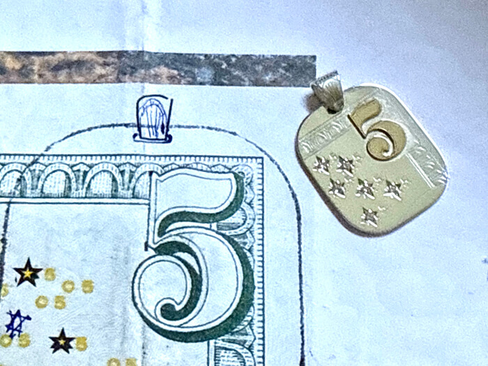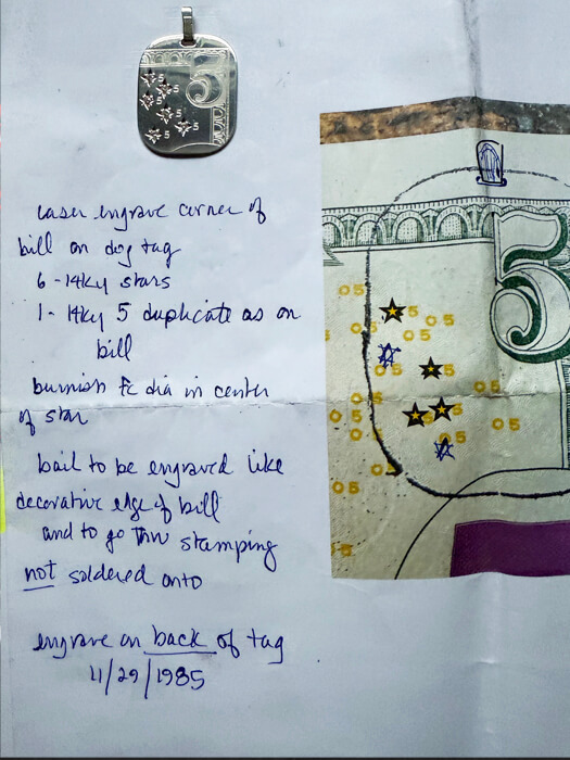 This is the second design I had the privilege to do for this client. She is a funny, vivacious person with a keen sense of humor. She moved out of the area but when visiting she made a special trip to see me. She had a general idea that she wanted something to memorialize her marriage with some of the remaining stones that were left from the redesign of her wedding set. As we were chatting and catching up on life I asked her how they first met. She had quite the funny story to share. At the end of their first time meeting, sparks were flying and he asked for her phone number. She did not have a piece of paper (as this was before cell phones existed). He pulled a $5 bill out of his pocket and they giggled as she jotted down her number on there. That is where the magic began, a moment they think back on fondly. After hearing this, I suggested that we use the corner of the five dollar bill, duplicate the pattern and incorporate the number five on a sterling silver dog tag. The five is highlighted in 14k yellow gold and the smaller stars feature full-cut diamonds set in beads and bright cuts to mimic the stars. The bail feeds thru the tag and also has the bill’s pattern engraved on it. The challenge here was determining how to replicate the pattern as the ink does not print – understandable, though as it’s a measure to help prevent counterfeits. As a workaround, using a negative process and laser engraver, the edge of the bill was replicated. After that the 14k yellow gold plate was engraved and cut out to fit onto the tag. The diamonds were set as stars on the bill. And for an extra special touch we added engraving: “11-29-1985” to commemorate the day they met. This is truly a one of a kind piece: sentimental, romantic. And forget $5… this necklace and the memory it represents is priceless!