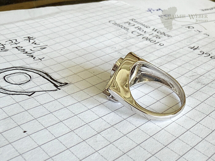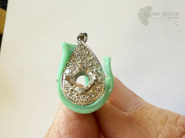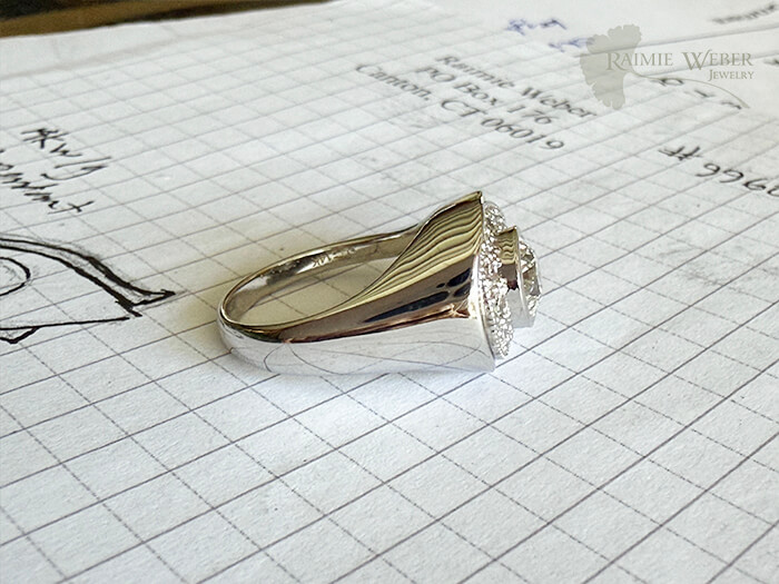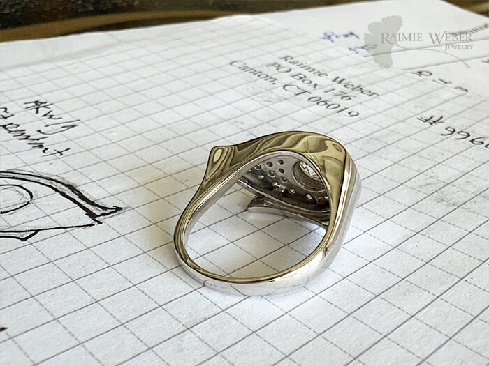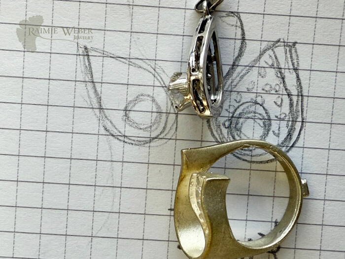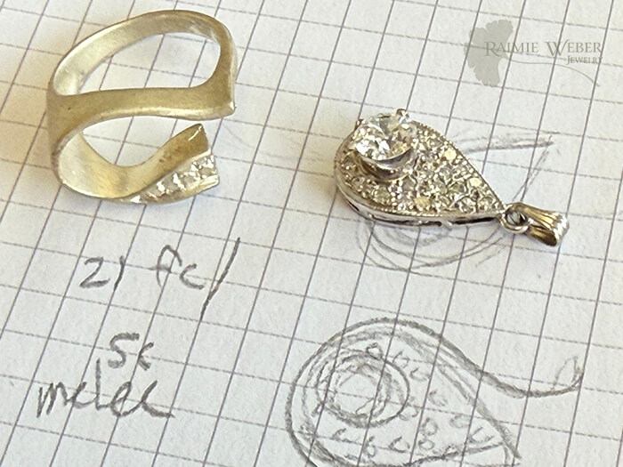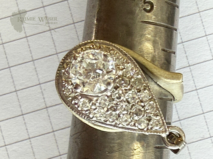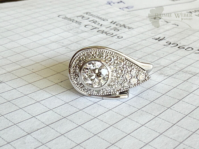 I’m so grateful for this extraordinary woman. She’s talented, funny, thoughtful, and kind. I’ve had the pleasure of knowing her for decades. She used to visit the shop I owned with my dad and, with the biggest smile, say, “This is the happiest place in the world.” Fast forward to today, and she has taken her incredible design eye from the worlds of graphics and advertising into jewelry. She now creates her own beautiful line of sterling silver necklaces, bracelets, and earrings. I’m truly honored that she trusted me to collaborate with her on this special redesign and fabrication. We began with a meaningful pendant that belonged to her grandmother Rose. It passed to her mother Ruth, and is now Naomi’s. While she isn’t typically a pendant wearer, she loves rings. So we decided to transform this heirloom into something she would wear and cherish every day. We incorporated a ring design originally created by my father, Fil, subtly adjusting the curves so the paisley pendant would nest seamlessly into the setting. The largest diamond was reset from prongs into a bezel for a more cohesive and secure look. The pendant was carefully re-tipped and repaired as needed to preserve the integrity of the smaller diamonds. We completed the piece with a bright polish on the mounting, creating a beautiful contrast against the textured pavé center. And now she has herself a three-generation heirloom, thoughtfully reimagined into a ring that honors the past while celebrating the present.