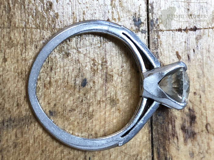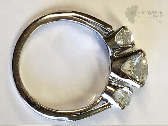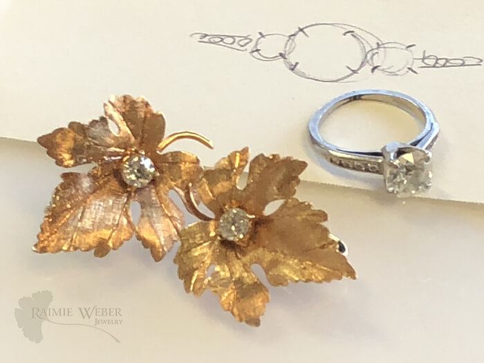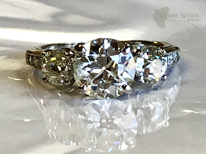 This special client is a repeat customer who has visited me in the past for gifts for her girls as well as repairs. Shortly after I hosted my latest estate buying event, we ended up chatting and she described multiple family heirlooms that she wanted me to look at. We set a date and in she came with several lovely pieces. The only items that I felt could and should be combined were a pair of non-pierced leaf earrings and her engagement ring. My reasoning behind this guidance was this: all of the diamonds had come for her husband’s family. He had designed the engagement ring – the center diamond had come from his mother. It had been damaged as some point, repairable but not crucial to this project. Yes, repairing the stone would increase the value of the stone. But that was not as important to her as keeping the stone as is. The leaf earrings were from his mother as well and all three diamonds are Old European-cut dating back to at least the 19th century. Although she didn’t want a total reimagining of her ring, she did want it updated a little bit. So I suggested that we reset the earring stones into similar settings as the largest diamond and reassemble the ring into a classic three-diamond ring, with channel style cathedral shoulders set with full-cut diamonds. The end goal is stunning. The engagement ring has been modified yet we were able to preserve her husband’s original vision. And now it includes two more family stones, that both enhance the classic design and make this engagement ring all the more special.