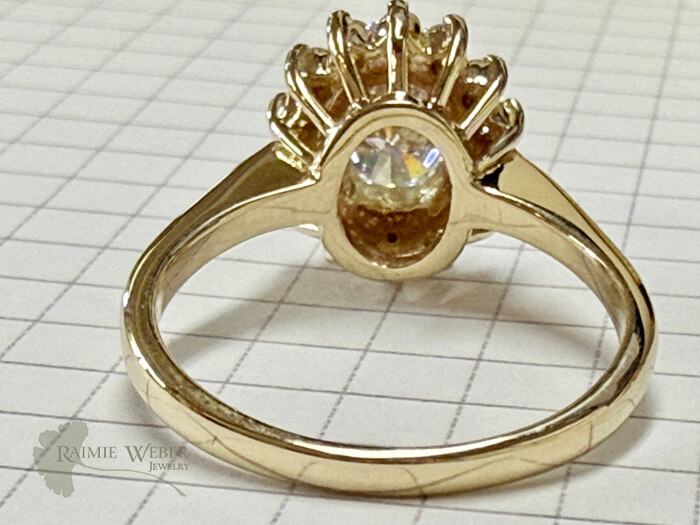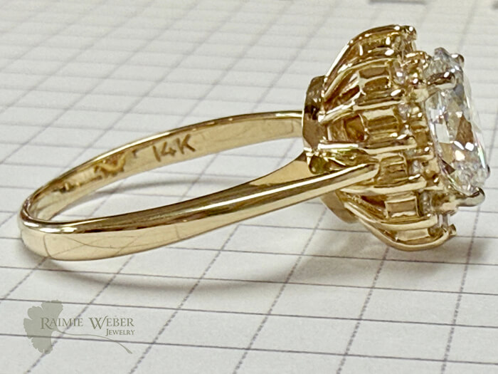 He first visited the shop during the holidays a few years ago and was immediately drawn to one of my necklace designs from the teensie collection. Recently, the couple returned together. She was wearing the necklace, he was beaming with pride. This time, the visit was to reimagine a cherished family ring as their engagement ring. Petite in stature yet unmistakably striking, she inspired a design that honors both her presence and the ring’s history. The original piece featured a classic halo design, a style made iconic decades ago by the engagement of a beloved princess. We explored a range of options, including natural and lab-grown diamonds, carefully reviewing the benefits and costs of each. The redesign was guided by the existing yellow citrine being removed, whose shape and size set important parameters. To ensure the integrity and longevity of the new setting, the prongs were replaced, a practice I strongly prefer when securing a new center stone. The final design features a lab-grown oval brilliant-cut diamond, surrounded by fourteen full-cut natural diamonds. Their wedding date is set for 2026, and it was an honor to be part of such a meaningful chapter in their story.
