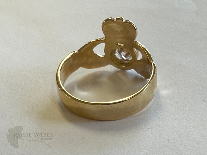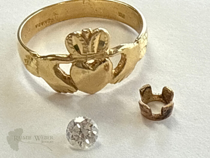 This client came to me as a referral after her husband passed. She brought in her original engagement ring as well as his wedding band, a claddaugh ring. They shared a long and loving marriage and she wanted to honor that by creating something she could wear to keep him close. The first challenge was to size down his ring without warping or distorting the claddaugh. The next was to incorporate the setting using the heart as the base. Her diamond is really pretty so I wanted to ensure that the back would be open enough to allow the light to dance around in the stone. But I was also mindful of keeping everything low since this was intended for daily wear. The good thing was that his ring is substantial enough to allow the heat needed to customize the ring. Once we were done this lovely client was thrilled to wear this on her finger. And how extra sweet that she’s chosen to wear this with the heart facing in because her heart is still very much “taken.”