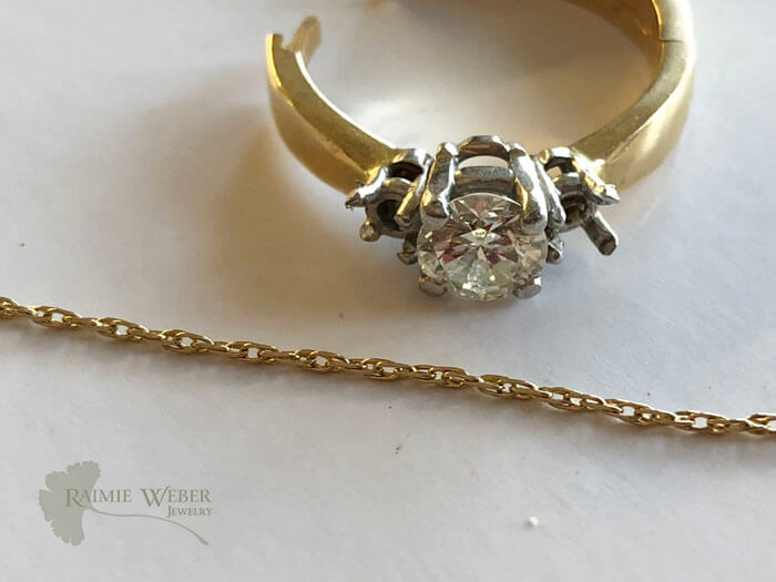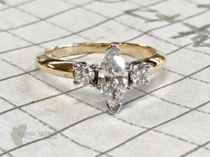 This project began with a ring containing three diamonds. On a previous project with this client we reset the marquise diamond into a new crown and added the two round diamonds, one per side. The largest diamond was bequeathed to the oldest granddaughter. She is closest to her grandmother so it’s particularly fitting. They spent a great deal of time together including a very special cross-country trip! The granddaughter is not a flashy kind of gal, so for this piece we were looking to do something that was simple, classic and clean. We cut the crown, with the stone set, away from the ring and added links to attach the chain – an 18” machine rope with a lobster clasp. When mom came to pick this up she tried it on and we both were thrilled with the final design. Surely her daughter would be delighted with this timeless diamond pendant necklace that honors her beloved grandmother.