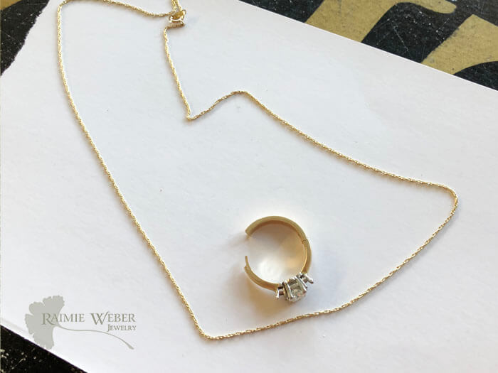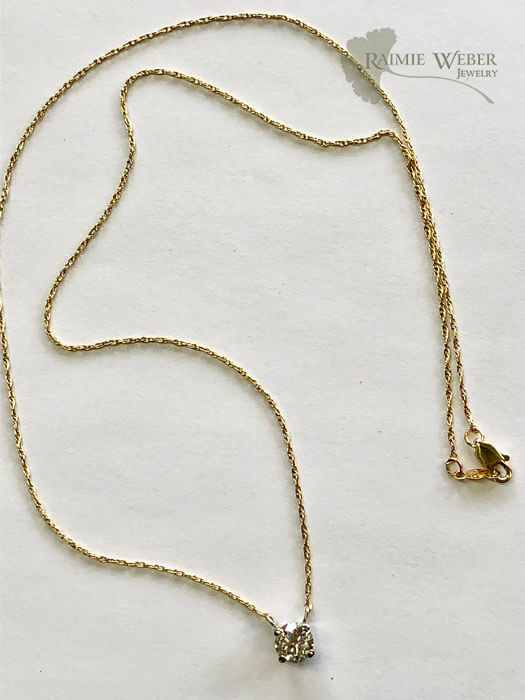 This project began with a ring containing three diamonds. On a previous project with this client we reset the marquise diamond into a new crown and added the two round diamonds, one per side. The largest diamond was bequeathed to the oldest granddaughter. She is closest to her grandmother so it’s particularly fitting. They spent a great deal of time together including a very special cross-country trip! The granddaughter is not a flashy kind of gal, so for this piece we were looking to do something that was simple, classic and clean. We cut the crown, with the stone set, away from the ring and added links to attach the chain – an 18” machine rope with a lobster clasp. When mom came to pick this up she tried it on and we both were thrilled with the final design. Surely her daughter would be delighted with this timeless diamond pendant necklace that honors her beloved grandmother.