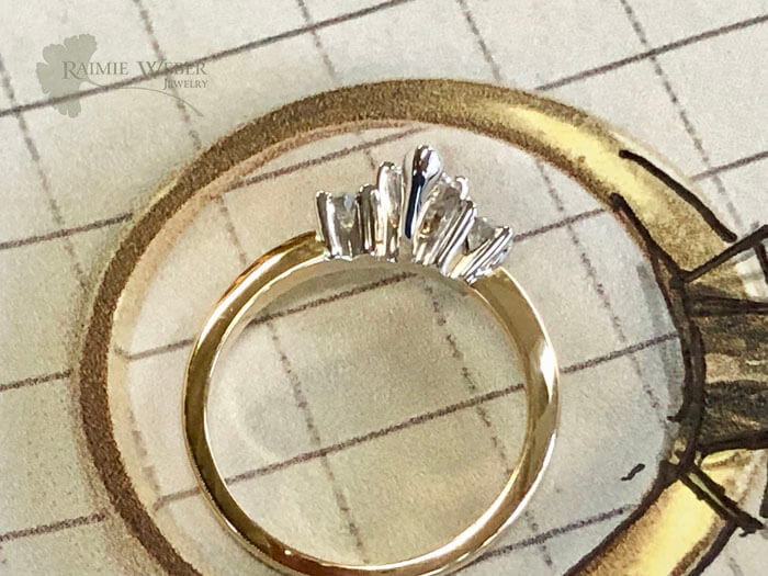I’ve had the pleasure of knowing this client for many years. She’s a local journalist with an excellent reputation and we’ve gotten to collaborate on many of her jewelry projects along the way. Most recently she came into the shop in need of some appraisal work. While in, I noted that her engagement ring was in need of some repair. The center crown was worn making the diamond at risk of falling out. She recently acquired her mother’s jewelry. During her visit she brought along the contents of her mother’s safety deposit box so that I could assess this stash as well. Among the beautiful baubles was her mother’s engagement ring, damaged and no longer wearable. In discussing the need to update her own engagement ring we decided to do an enhancement that would incorporate her mother’s smaller round diamonds to either side of her marquise cut diamond. I provided all new crowns, used her original shank from the engagement ring and created a newly revisioned three-stone engagement ring. A timeless beauty! The largest round diamond is for another project, another day.