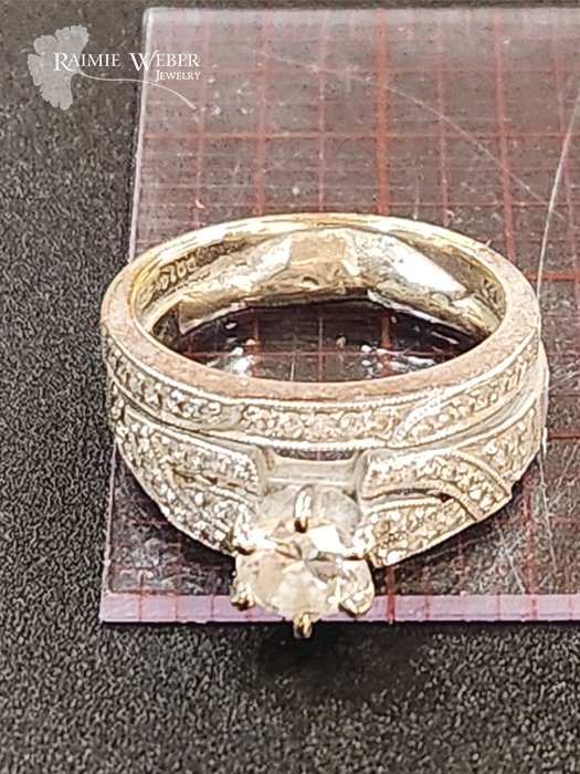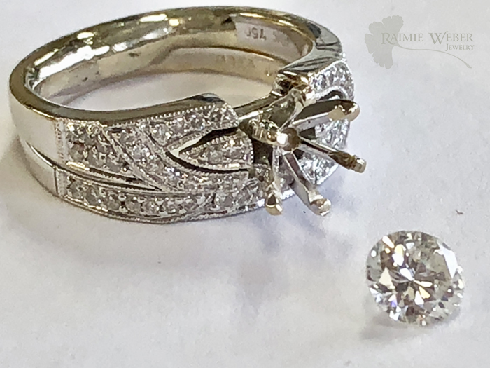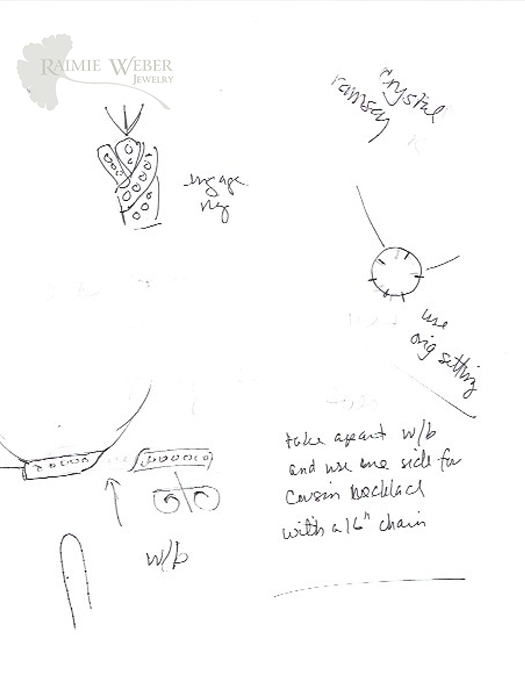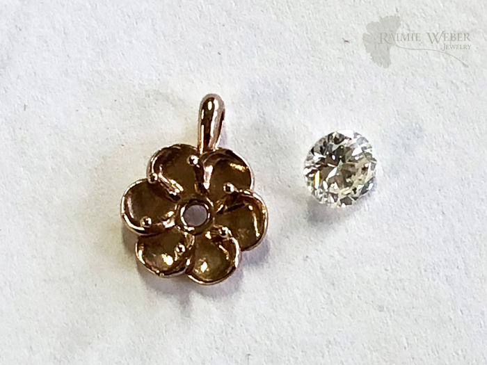 This client originally found me online. She wrote to me about her grandmother’s wedding set. Her nana had reset her original engagement diamond into this. And just like grandma, this client wanted to restyle it for herself to make it her own. And so began our lengthy email correspondences. She sent along photos of the ring, photographed on a grid that gave me a very good sense of scale. I wrote back with some sketches and suggestions. She decided that she’d like a classic solitaire pendant with a little something extra. What that was, we still weren’t entirely sure. She loves rose gold – her wedding set is rose gold and it looks beautiful with her complexion. With that knowledge, I suggested that we mount the diamond in a 14k rose gold stylized flower pendant. She absolutely loved the idea. We set a date for her to come to the shop. She brought her aunt, an equally lovely woman. They had a wonderful visit which was also very productive. During their time here I pulled the diamond from the mounting so I could measure and weigh it. We also looked at chains for length and link style. I had several different rose gold options to choose from. She was thrilled with the final outcome – a flower diamond from her beloved grandmother in rose gold. The perfect way to keep Nana close to hear heart.