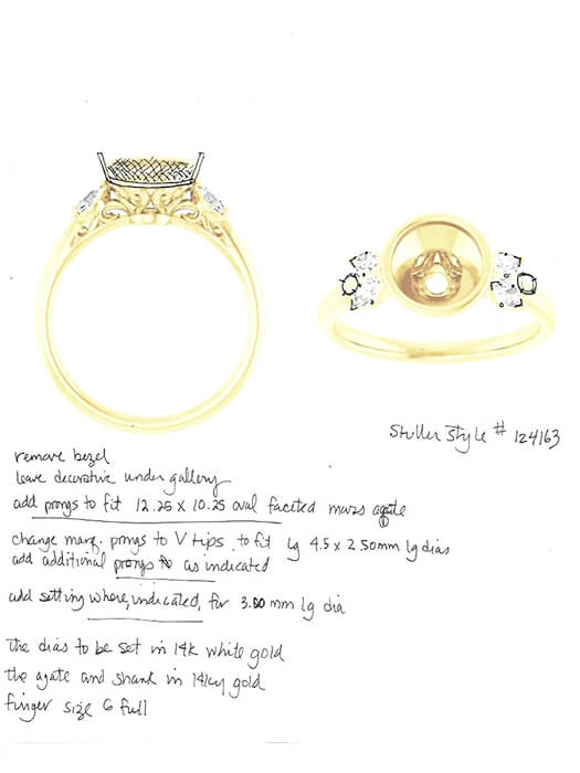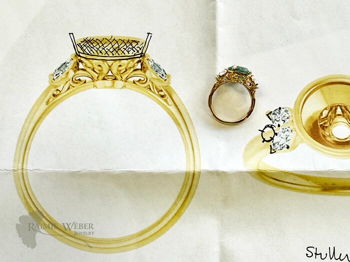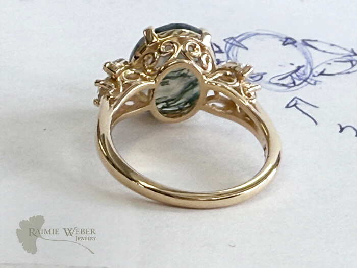This client did her homework, first reaching out to me online through my website. She compiled a Pinterest board designed with her love’s floral-inspired likes in mind which came in very handy for inspiration. She had a great but uncommon stone choice: moss agate. But interestingly enough, this wasn’t the first engagement ring that I’ve crafted incorporating this beautiful stone. Moss agate is unique in the way that it makes you feel like you’re wearing a piece of greenery in your jewelry. My client found the perfect stone. Once she had it in hand, we made an appointment for her to come into the shop for further exploration. Nature is the theme of this ring, a given. We used the moss agate and accented it with lab grown diamonds in both a marquis and round shape on either side of the agate. She was so very excited and had a beautiful plan to propose while they were vacationing in Italy. A romantic engagement followed by an unforgettable celebration with her family while there. Now that’s amore! Overall such a joyous, heartwarming project that I was so happy to be a part of.