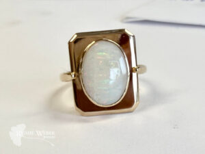This client lives up the road from my studio. After searching online for somewhere local to get an engagement ring he came across my photo gallery and loved what he saw. He wanted a Montana sapphire which, as you might’ve suspected, is mined in the great state of Montana. He had a specific size, shape and color in mind for his girlfriend. It is my experience that when working with colored gemstones one should be prepared to compromise a bit if necessary, as was true in this case. This stone was exactly what he wanted for color and shape but the size was just 1mm smaller. This small sacrifice in size more than made up for just how stunning this gem is. This is a well-cut stone so the light really dances around and when viewed from different angles, the colors become more and more evident. It really is a wonder to behold. To accent the sapphire, he chose lab grown pear-shaped diamonds with high color and clarity. The shape of the diamonds draws the eye up to the sapphire without overshadowing it yet gives it a nice pop of sparkle. The design is a classic three-stone engagement style ring with cathedral style shoulders. The stones are all set in prongs with the tips of the diamonds protected by teeny heart-shaped tips – an element spurred on by my inner hopeless romantic. He had a very specific date for his proposal so time was of the essence. And just as we hoped, it arrived. He proposed. And was met with an ecstatic, “Yes!”