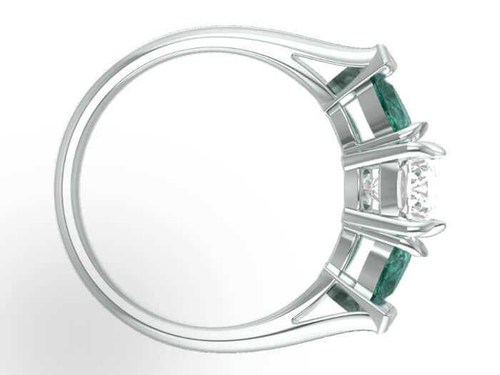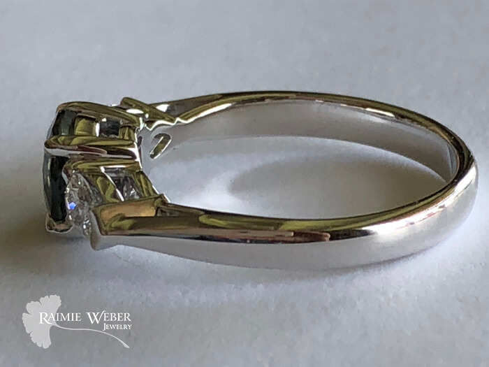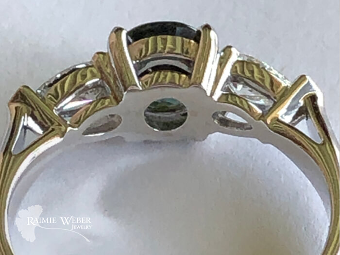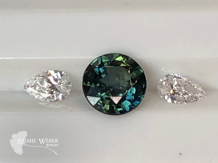 This client lives up the road from my studio. After searching online for somewhere local to get an engagement ring he came across my photo gallery and loved what he saw. He wanted a Montana sapphire which, as you might’ve suspected, is mined in the great state of Montana. He had a specific size, shape and color in mind for his girlfriend. It is my experience that when working with colored gemstones one should be prepared to compromise a bit if necessary, as was true in this case. This stone was exactly what he wanted for color and shape but the size was just 1mm smaller. This small sacrifice in size more than made up for just how stunning this gem is. This is a well-cut stone so the light really dances around and when viewed from different angles, the colors become more and more evident. It really is a wonder to behold. To accent the sapphire, he chose lab grown pear-shaped diamonds with high color and clarity. The shape of the diamonds draws the eye up to the sapphire without overshadowing it yet gives it a nice pop of sparkle. The design is a classic three-stone engagement style ring with cathedral style shoulders. The stones are all set in prongs with the tips of the diamonds protected by teeny heart-shaped tips – an element spurred on by my inner hopeless romantic. He had a very specific date for his proposal so time was of the essence. And just as we hoped, it arrived. He proposed. And was met with an ecstatic, “Yes!”