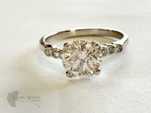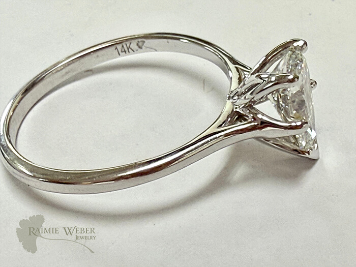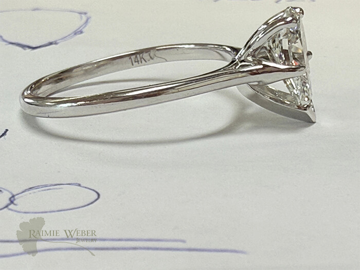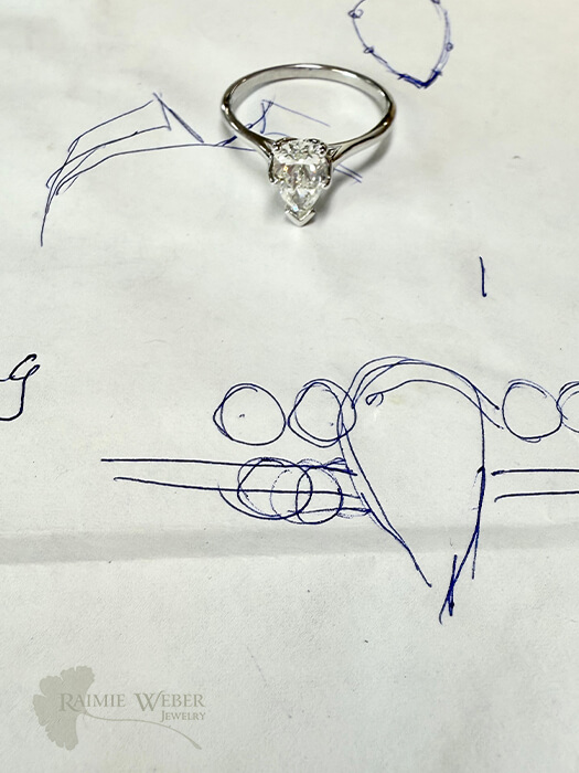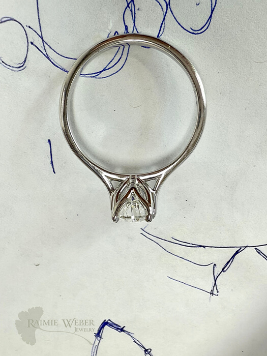 These two were referred to me by his mother, a lovely past client. This couple has been together for a while. They have a family and a house so they decided they were long due for a proper wedding! Our first chat was to establish what their vision was. I was there to guide them and bring their vision to fruition. She has beautiful hands, perfect to showcase an elegant engagement ring. I made several suggestions based upon our conversations. It’s so insightful to hear a couple’s interactions to help gauge what they might be drawn to. It was settled. She wanted a lab created diamond in the brilliant pear shaped cut. She wanted it to be as high as possible while being wearable with an active family. She also preferred white metal. My contribution to this design was to create a classic Tiffany style with a spin. The prongs holding the diamond are open, allowing more light to dance into the diamond, letting off spectacular color. The tip is a chevron to protect the stone. The challenge was to set the stone low enough without splaying the crown because it is a good size. When he came to pick it up, an element of surprise still remained as he had a special plan to pop the question. No doubt she will say yes!