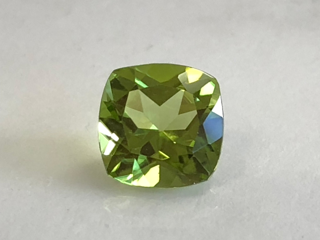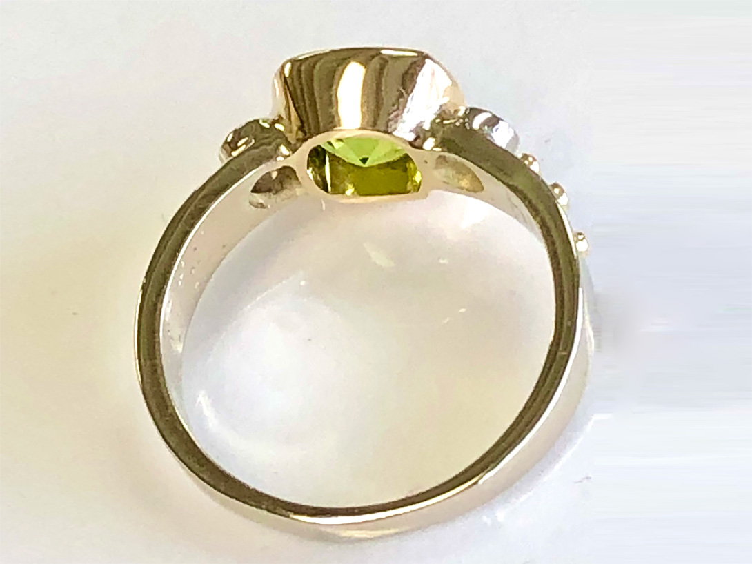 We selected and replaced the original damaged and worn peridot with a brand new fresh peridot. The stone size needed to be the same as the original because of the construction of the ring itself. The stone was selected by the customer, and I confirmed the quality to make sure the color was even and saturated. A notable difference – the original stone was faceted traditionally, whereas the new stone is known as a “checkerboard” because the table (flat top facet) is actually sectioned like a checkerboard creating more facets for light to play with!