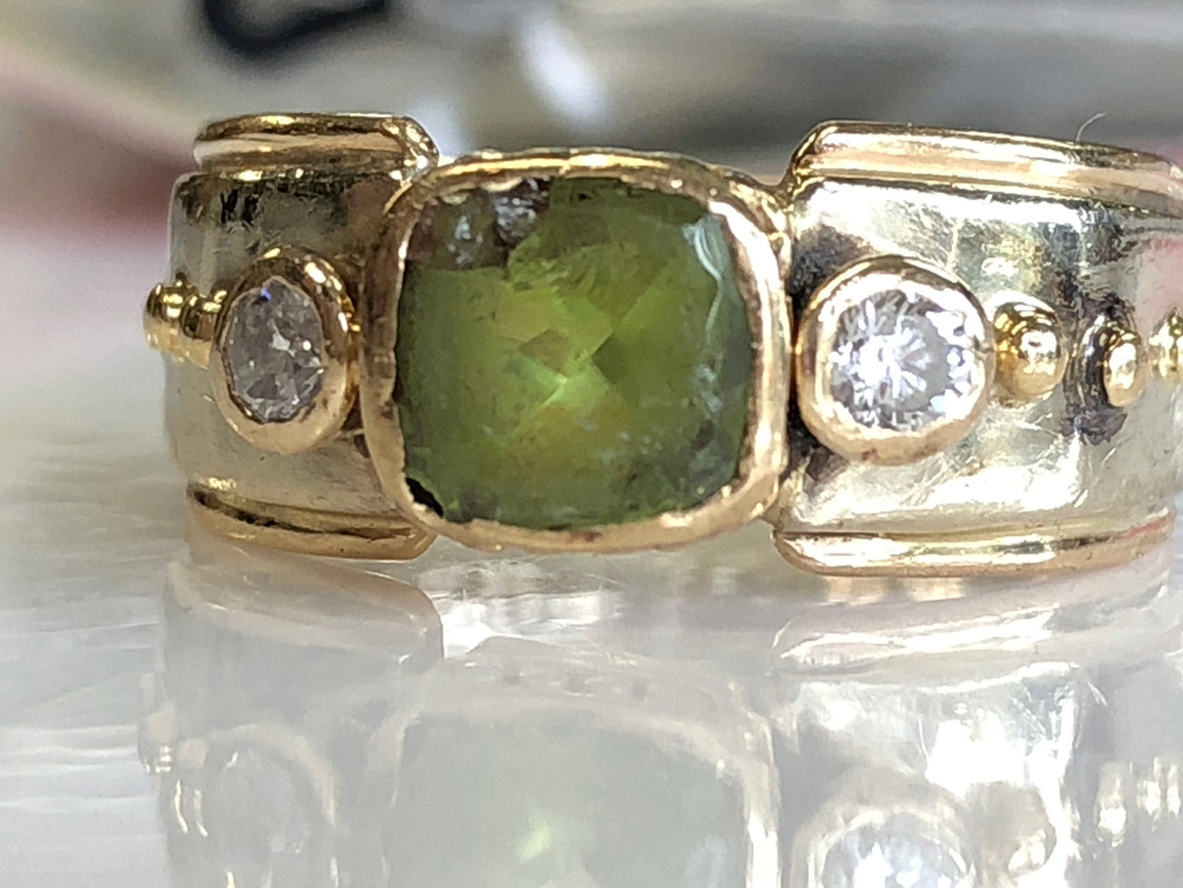 - Since the peridot is too worn for repair, replace it with a new one and reset it into a new yellow gold bezel.
