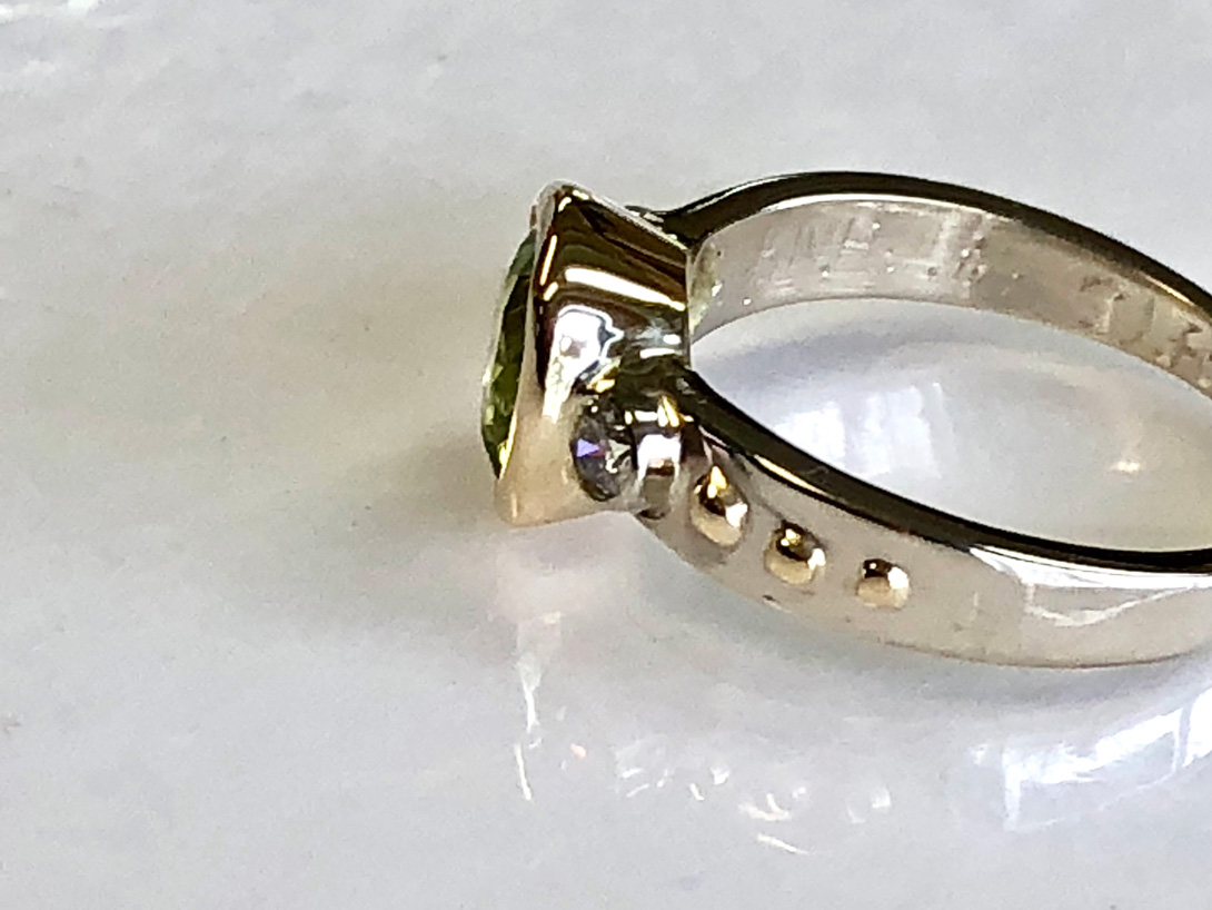 - 14k white gold peridot engagement ring with 14k yellow gold accents and diamonds
