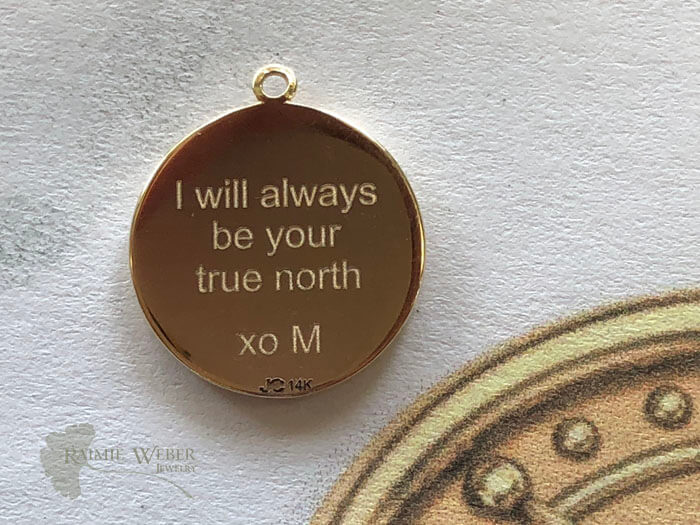 I’ve had the privilege of doing some wonderful design work for this particular client. And this special piece was no different. Her daughter had a milestone birthday recently and she had an idea for a thoughtful, heartfelt gift. A talisman she could wear as a reminder of her mother’s love and guidance wherever she might find herself. This client found a photo for us to use as inspiration but wanted something a bit more refined. I started with the image, using CAD to do a bit of sprucing up to the design to fit this client’s vision. We ended up creating the perfect charm for her to gift her daughter. Engraved on the back: “I will always be your true north.” What an incredibly maternal and everlasting sentiment.