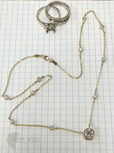 This client wandered into the shop after liking what she saw on my website. With her 35th anniversary and a milestone birthday both quickly approaching, she realized that her wedding set was in need of some TLC. Her engagement ring, a marquise cut diamond simulate, had started showing some wear and was not nearly as sparkly as it once was. I just knew that a lab grown diamond would be a perfect solution for this redesign. I brought in a variety of marquise cut lab grown diamonds for her to sort through. She fell in love with one that happened to be larger than her original. This meant we’d need a new crown to secure the size of the new stone. She wanted to change how it was set, opting for a bezel instead of the original prongs. The bezel had to be special ordered because of the size of the diamond. I did some doodling, and suggested the new engagement ring be done in white gold, while also incorporating the original yellow gold wedding band and engagement ring. A new set by fabrication! With all of these modifications we could easily have done an entirely new ring. But she just loves her original and what better way to pay homage to the original set than to repurpose them in a fresh, new way? The rings are soldered at the base, with the design of the set spanning the length of the diamond. The bezel is a modified martini style setting and exposes the belly of the diamond so lots of light can dance in and around – just what she was seeking. The prongs from the engagement ring needed to be removed and the by-pass in the new ring needed to be extended. Once my work was complete, she returned with her husband and I was so touched by how much they both loved the new wedding ring design. This client has beautiful hands and the new, larger stone looked right at home upon her ring finger. Big, big smiles all around – and just in time for a double milestone celebration.