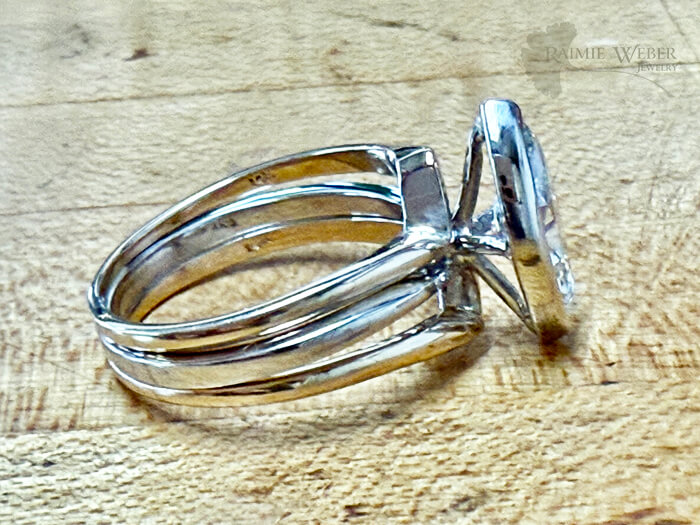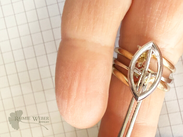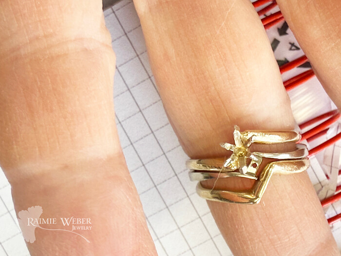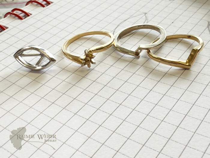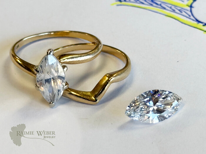 This client wandered into the shop after liking what she saw on my website. With her 35th anniversary and a milestone birthday both quickly approaching, she realized that her wedding set was in need of some TLC. Her engagement ring, a marquise cut diamond simulate, had started showing some wear and was not nearly as sparkly as it once was. I just knew that a lab grown diamond would be a perfect solution for this redesign. I brought in a variety of marquise cut lab grown diamonds for her to sort through. She fell in love with one that happened to be larger than her original. This meant we’d need a new crown to secure the size of the new stone. She wanted to change how it was set, opting for a bezel instead of the original prongs. The bezel had to be special ordered because of the size of the diamond. I did some doodling, and suggested the new engagement ring be done in white gold, while also incorporating the original yellow gold wedding band and engagement ring. A new set by fabrication! With all of these modifications we could easily have done an entirely new ring. But she just loves her original and what better way to pay homage to the original set than to repurpose them in a fresh, new way? The rings are soldered at the base, with the design of the set spanning the length of the diamond. The bezel is a modified martini style setting and exposes the belly of the diamond so lots of light can dance in and around – just what she was seeking. The prongs from the engagement ring needed to be removed and the by-pass in the new ring needed to be extended. Once my work was complete, she returned with her husband and I was so touched by how much they both loved the new wedding ring design. This client has beautiful hands and the new, larger stone looked right at home upon her ring finger. Big, big smiles all around – and just in time for a double milestone celebration.
